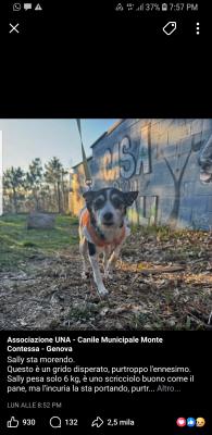 Vorremmo che potesse passare i suoi ultimi giorni in una casa calda, ancora amata. Emilia Romagna Sally sta morendo. Questo è un grido disperato, purtroppo l'ennesimo. Sally pesa solo 6 kg, è uno scricciolo buono come il pane, ma l'incuria la sta portando, purtroppo, a una fine ingiusta. Ha un tumore mammario di grosse dimensioni, ulcerato, il quadro toracico è compatibile con metastasi. Lei è ancora vispa, ha voglia di vivere, ma non le resta molto. È arrivata da noi da poco, trovata per strada, lasciata al suo destino. Nessuno l'ha mai cercata. Sally ha 11 anni e non chiede molto. È docile, tranquilla. Merita di non morire in canile, ma di passare il poco tempo che le rimane amata in una vera famiglia, una famiglia che le faccia dimenticare il passato e che le faccia capire che non tutte le persone sono malvagie. Non possiamo accettare che la sua vita finisca qui. Venite a conoscerla, datele una possibilità. Sally vi aspetta. Per informazioni: 010 8979374 351 031 7835 371 572 4119 (solo SMS e messaggi Whatsapp) Canale Whatsapp: https://whatsapp.com/channel/0029VbAccGD9Bb5vkuzetu2K » Canale Telegram: https://t.me/canilemontecontessa » adozioni@associazioneuna.org » info@associazioneuna.org » http://associazioneuna.org » Se volete aiutare i nostri ospiti, potete donare cibo ed oggetti necessari al loro benessere acquistandoli nelle liste di Amazon, da Il Cucciolo al Mercato Orientale, L'Isola dei Tesori in Corso Martinetti, Zampalesta in Piazza Rossetti, Il Paradiso dei Cuccioli in via Napoli, Farmacia Papa in via San Lorenzo, negozi DM, Prodet di via Sestri e Tigotà di via Sestri, via Fiumara, via Cornigliano, via Rolando e via Camozzini. Grazie a chiunque ci aiuterà! Aiuta i nostri gatti con 1€ al mese: https://www.teaming.net/unacanilemontecontessa » Dona il cibo che utilizziamo in canile: https://mangimesospeso.feed-0.it/canile/canile-monte-contessa/ » Lista cani Amazon: https://www.amazon.it/hz/wishlist/ls/1CTQJQG29M8I3?ref_=wl_share » Lista gatti Amazon: https://www.amazon.it/hz/wishlist/ls/3465JOLX23PYY?ref_=wl_share » Riferimento per PayPal: donazioni@associazioneuna.org » Wishraiser (Dona e Vinci): https://www.wishraiser.com/associazione-una?from=https%3A%2F%2Fwww.wishraiser.com%2Fsearcn »