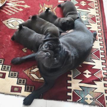 Cuccioli di Carlino neri maschi e femmine, nati ad Aprile, altissima genealogia. Genitori e nonni pluri eccellenti in esposizioni e Campioni di Bellezza, tutti presenti e visibili. Verranno disponibili da metà giugno con Pedigree ENCI, libretto sanitario e Certificato di Buona Salute.