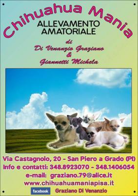 Disponibili cuccioli di chihuahua sia pelo corto che lungo CON PEDIGREE ENCI anche nei colori piu' rari come il blu , liliac , brindle , cioccolato ecc . Saranno consegnati con sverminazione , vaccinazione completa , microchip con iscrizione anagrafe canina a partire da 60 giorni dalla loro nascita . Forniamo inoltre tutto compreso anche il passaggio di proprieta' dell'asl e il kit cucciolo con tutto il necessario che serve . POSSIBILITA' DI PAGAMENTI AGEVOLATI . Stalloni e fattrici sempre visibili in quanto nostri . Ottime linee di sangue sia per l'esposizione che per la riproduzione. N.O.T.A. B.E.N.E.... NO EMAIL , SOLO CONTATTO TELEFONICO. PER INFO E CONTATTI : "ALLEVAMENTO CHIHUAHUA MANIA PISA" Via Castagnolo 20 San Piero a Grado PISA GRAZIANO DI VENANZIO 348.8923070