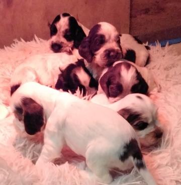 Cucciolata 7 Cocker. 4 maschi e 3 femmine. Bianco-Cioccolato, Tricolore Cioccolato, Roano cioccolato, Blu Roano, Tricolore. Madre Tricolore cioccolato roana microchip 380260044713879. Padre Blu roano microchip 380260160264443. Entrambi i genitori sono sempre visibili perché in casa insieme a noi e ai cuccioli. Ottima genealogia (provenienza Francini e Black Mirtilla's) I cuccioli verranno consegnati con iscrizione anagrafe canina, Pedigree, certificato veterinario, doppia sverminazione.