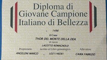 Maschio THOR DEL MONTE DELLA DEA: Giovane Campione Italiano di Bellezza 2022. Ha vinto numerose gare di bellezza in tutta Italia. Il cane è un ottimo esemplare maschio di Lagotto di color marrone. Ha il pedigree ENCI e il deposito DNA. Inoltre, ha eseguito tutti i controlli radiografici.