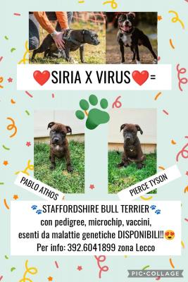 I genitori sono i fantastici Siria e Virus, entrambi derivano da cani importanti che stanno facendo la storia di questa razza tramite l'allevatrice Tatiana Ferro che è la super esperta e amante profonda di Staffy, ha allevato entrambi i genitori dei cuccioli (Siria e Virus) e si rende disponibile per qualsiasi informazione o curiosità. Tatiana è un riferimento sul territorio anche perchè organizza allenamenti e gare sportive o di bellezza per la razza!
