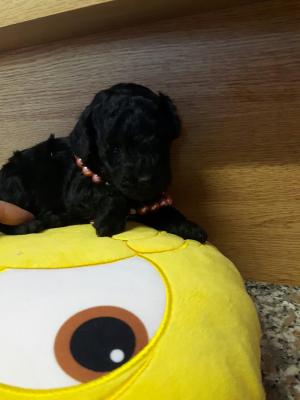Cucciola di barboncino colore nero,femmina nata il 31/12/2018 e disponibile a fine febbraio con le due vaccinazioni fatte,il microchip e il pedigree ENCI,i genitori sono toy e sono visibili in allevamento