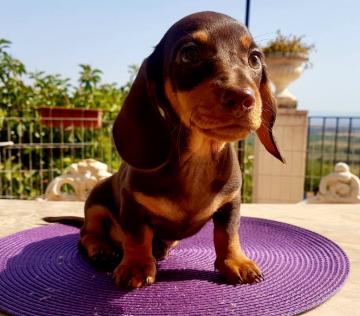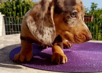 Nati in casa di appassionati della razza, svezzati con i migliori mangimi in commercio e allevati con massima cura vendesi cuccioli di Bassotto tedesco taglia nano kaninchen (taglia piccola max 4kg da adulti) disponibili sia maschi che femmine nei colori Arlecchino cioccolato e Cioccolato. Ottime linee di sangue. I cuccioli verrano consegnati con pedigree Enci, microchip, vaccinazioni e sverminazioni, puppy kit. Possibile consegna in tutta Italia. Informazioni e prezzo al 3476371963