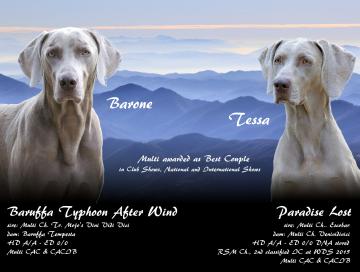 Barone e Tessa sono due splendidi Weimaraner delle migliori linee di bellezza e di lavoro. Entrambi certificati displasia A/O. Pluripremiati come miglior coppia in esposizioni Internazionali, Nazionali e Speciali di Razza. I loro splendidi cuccioli, nati il 24.03.18 sono allevati in famiglia, e saranno consegnati alle nuove famiglie vaccinati, e con un super pedigree. Ultimi maschi disponibili !!!