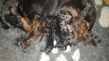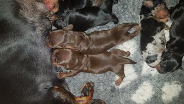 Cuccioli bassotto tedesco pelo raso chocolate e arlecchino