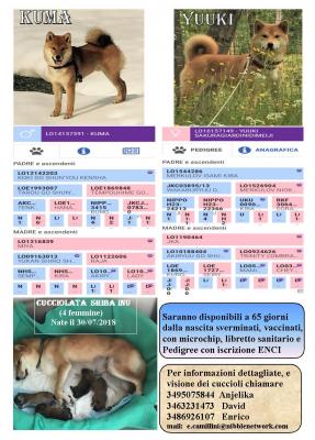 4 femmine di Shiba Inu nate il 30 luglio da genitori con pedigree di ottima genealogia acquistati in allevamento a Ravenna e con certificazione negativa per displasia alle anche. Possibile vederli dopo primo vaccino e microchip. Preferiamo trattativa privata.