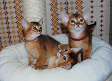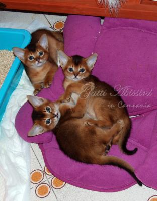 Sono disponibili 2 stupendi gattini abissini di colore lepre nati il 07.12.17 (1 maschietto e 1 femmina). I cuccioli verranno ceduti all'età di 3 mesi con regolare vaccinazione e sverminazione e saranno muniti di microchip, libretto sanitario e pedigree ANFI, in perfetta salute e socializzati, abituati alla lettiera e al tiragraffi. I genitori sono stati testati per PRA, PK-def e sono visibili in sede. Entrambi i genitori portano le linee rinomate (il papà è Campione CFA) e hanno un carattere eccezionale e particolarmente dolce. Per informazioni chiamate o scrivete abissiniincampania@libero.it, cell. 3401268476